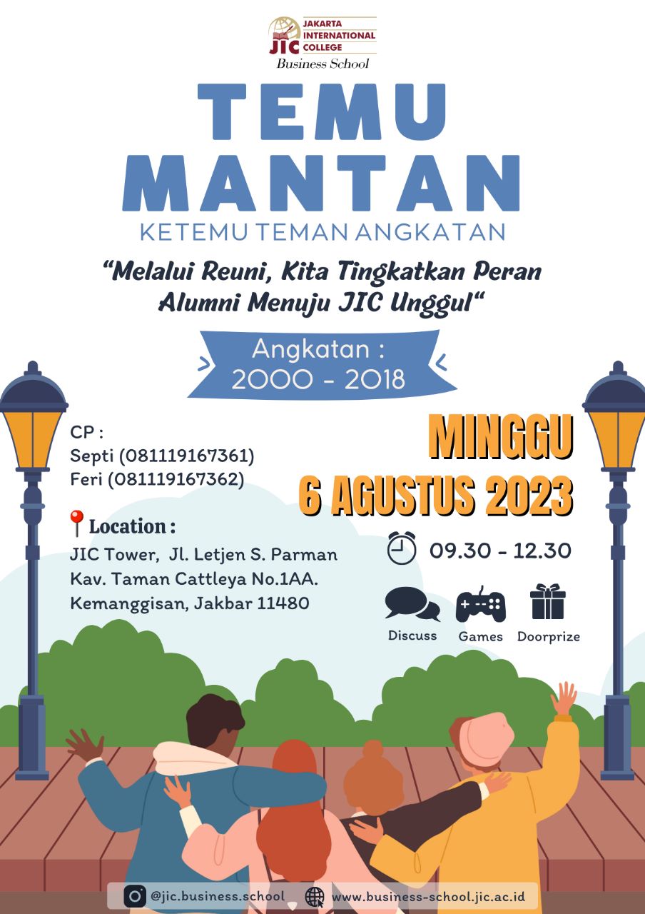 Udah lama ngga ketemu nih! Yuk kita kumpul lagi di acara Temu Mantan "Ketemu Teman Angkatan" yang akan dihadiri alumni dari angkatan tahun 2000-2018, sekaligus menginformasikan kabar gembira bahwa STIE JIC telah menjadi Universitas Jakarta Internasional (UNIJI). Acara akan diadakan pada: