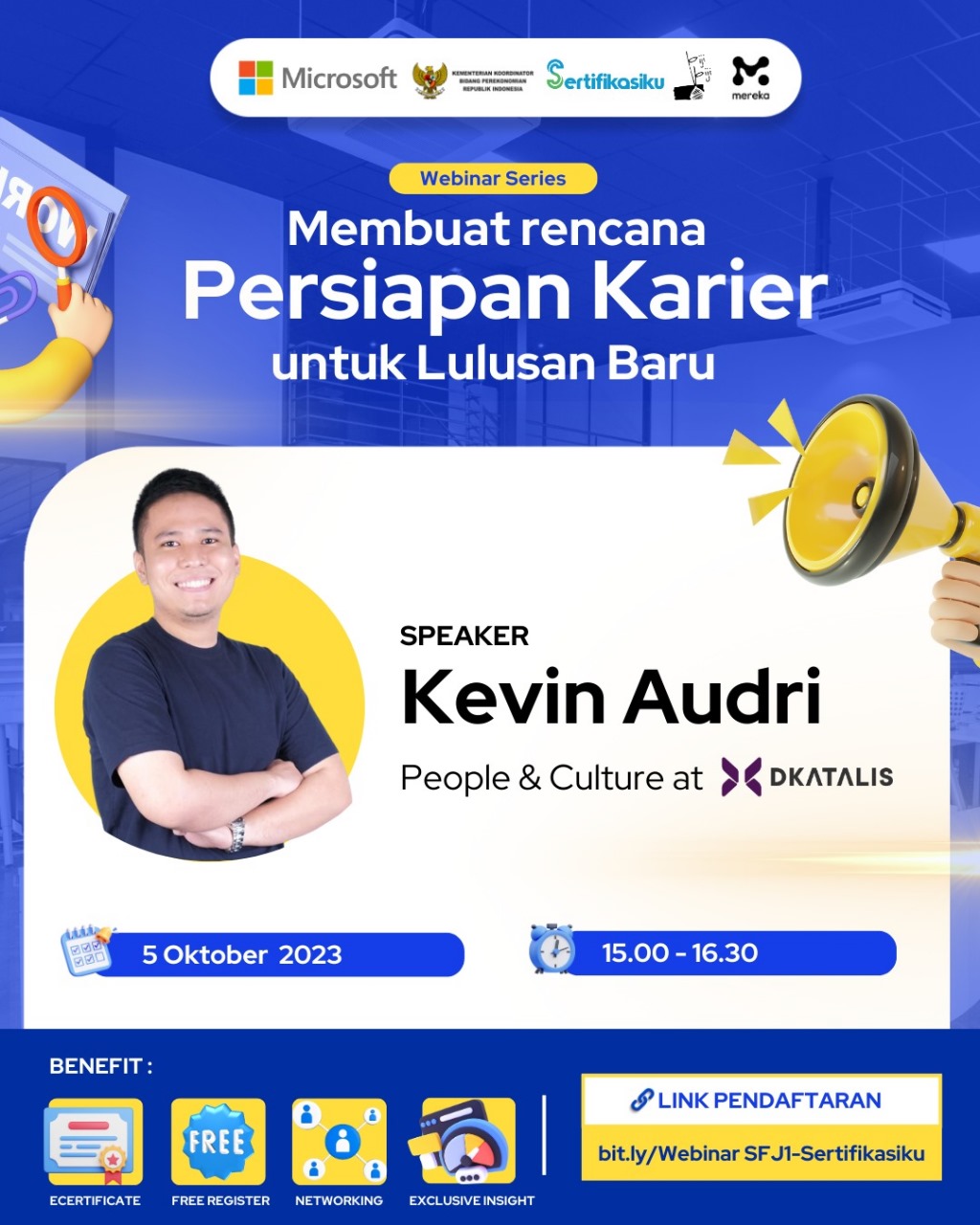 Gabunglah dalam webinar Microsoft Skill For Jobs Indonesia dengan Biji Biji Group dan Sertifikasiku tentang Persiapan Karir bersama Kevin Audri dari Dkatalis!